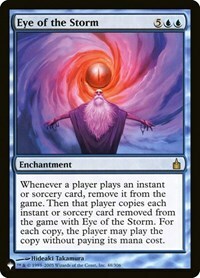 Whenever a player plays an instant or sorcery card, remove it from the game. Then that player copies each instant or sorcery card removed from the game with Eye of the Storm. For each copy, the player may play the copy without paying its mana cost.