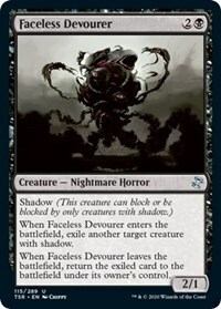When Faceless Devourer enters the battlefield, exile another target creature with shadow.