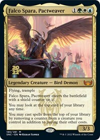Falco Spara, Pactweaver enters the battlefield with a shield counter on it.