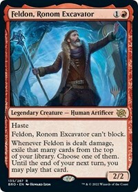 Whenever Feldon is dealt damage, exile that many cards from the top of your library. Choose one of them. Until the end of your next turn, you may play that card.