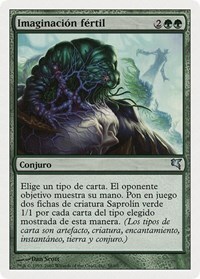 Choose a card type. Target opponent reveals his or her hand. Put two 1/1 green Saproling creature tokens into play for each card of the chosen type revealed this way. (The card types are artifact, creature, enchantment, instant, land, and sorcery.)