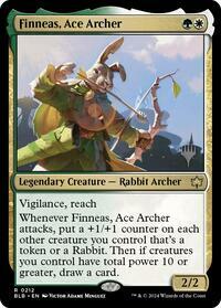 Whenever Finneas, Ace Archer attacks, put a +1/+1 counter on each other creature you control that's a token or a Rabbit. Then if creatures you control have total power 10 or greater, draw a card.