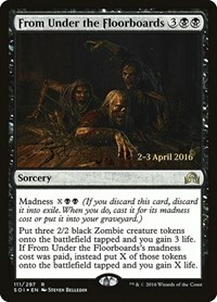 Put three 2/2 black Zombie creature tokens onto the battlefield tapped and you gain 3 life. If From Under the Floorboards's madness cost was paid, instead put X of those tokens onto the battlefield tapped and you gain X life.