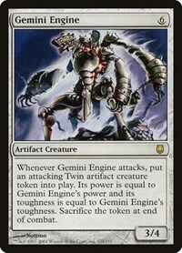 Whenever Gemini Engine attacks, put an attacking Twin artifact creature token into play. Its power is equal to Gemini Engine’s power and its toughness is equal to Gemini Engine’s toughness. Sacrifice the token at end of combat.