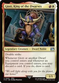 Whenever Giott or another Dwarf you control enters and whenever an Equipment you control enters, you may discard a card. If you do, draw a card.