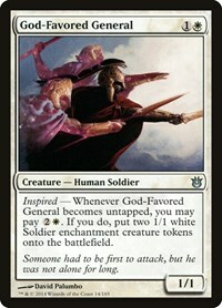 Inspired — Whenever God-Favored General becomes untapped, you may pay 2W. If you do, put two 1/1 white Soldier enchantment creature tokens onto the battlefield.