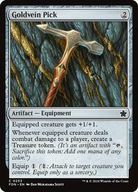 Whenever equipped creature deals combat damage to a player, create a Treasure token. (It's an artifact with "T, Sacrifice this artifact: Add one mana of any color.")