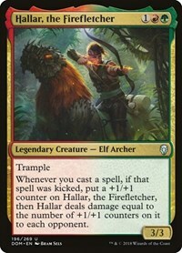 Whenever you cast a spell, if that spell was kicked, put a +1/+1 counter on Hallar, the Firefletcher, then Hallar deals damage equal to the number of +1/+1 counters on it to each opponent.