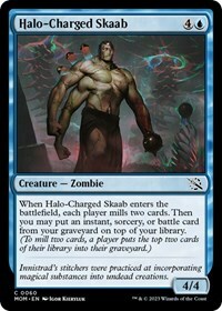 When Halo-Charged Skaab enters the battlefield, each player mills two cards. Then you may put an instant, sorcery, or battle card from your graveyard on top of your library. (To mill two cards, a player puts the top two cards of their library into their graveyard.)