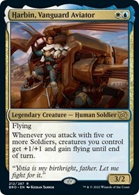 Whenever you attack with five or more Soldiers, creatures you control get +1/+1 and gain flying until end of turn.