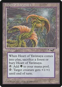 When Heart of Yavimaya comes into play, sacrifice a forest or bury Heart of Yavimaya.T: Add G to your mana pool.T: Target creature gets +1/+1 until end of turn.