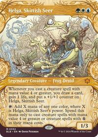 Whenever you cast a creature spell with mana value 4 or greater, you draw a card, gain 1 life, and put a +1/+1 counter on Helga, Skittish Seer.