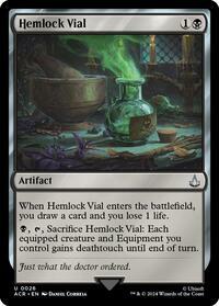 B, T, Sacrifice Hemlock Vial: Each equipped creature and Equipment you control gains deathtouch until end of turn.