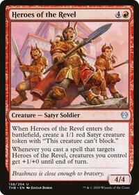 When Heroes of the Revel enters the battlefield, create a 1/1 red Satyr creature token with "This creature can't block."