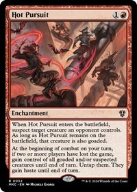 When Hot Pursuit enters the battlefield, suspect target creature an opponent controls. As long as Hot Pursuit remains on the battlefield, that creature is also goaded.