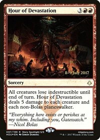 All creatures lose indestructible until end of turn. Hour of Devastation deals 5 damage to each creature and each non-Bolas planeswalker.
