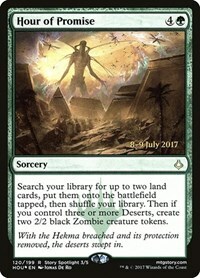 Search your library for up to two land cards, put them onto the battlefield tapped, then shuffle your library. Then if you control three or more Deserts, create two 2/2 black Zombie creature tokens.