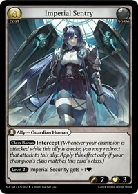 [Class Bonus] Intercept (Whenever your champion is attacked while this ally is awake, you may redirect that attack to this ally. Apply this effect only if your champion's class matches this card's class.) [Level 2+] Imperial Sentry gets +1 life.