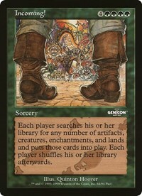 Each player searches his or her library for any number of artifacts, creatures, enchantments, and lands and puts those cards into play. Each player shuffles his or her library afterwards.