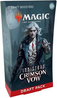 The Innistrad: Crimson Vow Draft Pack contains 3 Innistrad: Crimson Vow Draft Boosters, each with 15 Magic cards, 1 token or ad card, and 1 Helper card, with a combination of 1 Rare or Mythic Rare, 3 Uncommons, 10 Common cards, and 1 Land card. A traditional foil card of any rarity replaces a Common in 33% of Innistrad: Crimson Vow Draft Boosters.