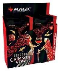 The Innistrad: Crimson Vow Collector Booster Box contains 12 Innistrad: Crimson Vow Collector Boosters and 1 box topper card. Each Collector Booster contains 15 Magic: The Gathering cards and 1 traditional foil double-sided token, with a combination of 5 Rares and/or Mythic Rares, 2–5 Uncommons, 4–7 Commons, and 1 Land card. Every pack includes a total of 10 traditional foil cards and a total of 8 cards with special treatments—including Showcase, Borderless, and Extended-Art cards.