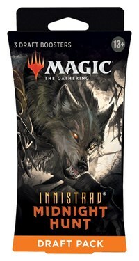 The Innistrad: Midnight Hunt Draft Pack contains 3 Innistrad: Midnight Hunt Draft Boosters, each with 15 Magic cards, 1 token or ad card, and 1 Helper card, with 1 Rare or Mythic Rare, 3 Uncommons, 10 Common cards, and 1 Land card. A traditional foil card of any rarity replaces a Common in 33% of Innistrad: Midnight Hunt Draft Boosters.