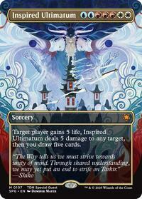 Target player gains 5 life, Inspired Ultimatum deals 5 damage to any target, then you draw five cards.