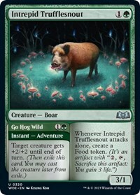 Whenever Intrepid Trufflesnout attacks alone, create a Food token. (It's an artifact with "2, T, Sacrifice this artifact: You gain 3 life.")
