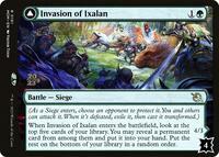 When Invasion of Ixalan enters the battlefield, look at the top five cards of your library. You may reveal a permanent card from among them and put it into your hand. Put the rest on the bottom of your library in a random order.