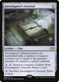 Investigator's Journal enters the battlefield with a number of suspect counters on it equal to the greatest number of creatures a player controls.