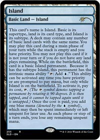 This card's name is Island. Basic is its supertype, land is its card type, and Island is its subtype. A deck may contain any number of basic land cards with the same name. You may play this card during a main phase of your turn while the stack is empty and you have priority. You may not play this card if it is not your turn or if you do not have any land plays remaining. while on the battlefield, this card is a basic Island permanent. Because it has the subtype Island, this permanent has the intrinsic mana ability "T: Add U." This ability can be activated any time you have priority or are prompted to pay mana, but only blue Island is on the battlefield. To activate it, pay its cost, T. (The T symbol denotes tapping a permanent by rotating it 90 degrees. it is then tapped, and it cannot be tapped again until it is untapped.) Once the cost is paid, you add one blue mana , which may then be spend immediately or left unspent for later use. As each phrase or step of a turn ends, you lose any remaining unspent mana.