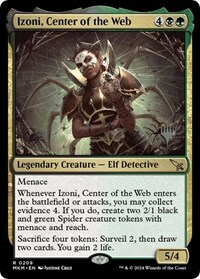 Whenever Izoni, Center of the Web enters the battlefield or attacks, you may collect evidence 4. If you do, create two 2/1 black and green Spider creature tokens with menace and reach.