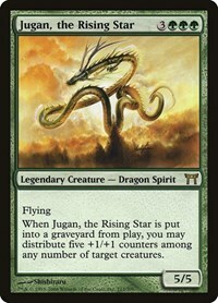 When Jugan, the Rising Star is put into a graveyard from play, you may distribute five +1/+1 counters among any number of target creatures.
