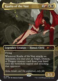 Whenever Kaalia of the Vast attacks an opponent, you may put an Angel, Demon, or Dragon creature card from your hand onto the battlefield tapped and attacking that opponent.