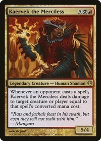 Whenever an opponent casts a spell, Kaervek the Merciless deals damage to target creature or player equal to that spell's converted mana cost.