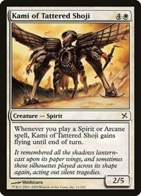 Whenever you play a Spirit or Arcane spell, Kami of Tattered Shoji gains flying until end of turn.