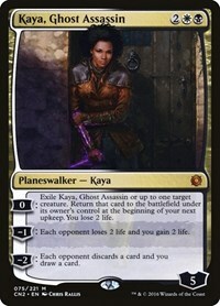 [0]: Exile Kaya, Ghost Assassin or up to one target creature. Return that card to the battlefield under its owner's control at the beginning of your next upkeep. You lose 2 life.
