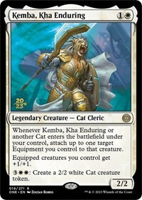 Whenever Kemba, Kha Enduring or another Cat enters the battlefield under your control, attach up to one target Equipment you control to that creature.