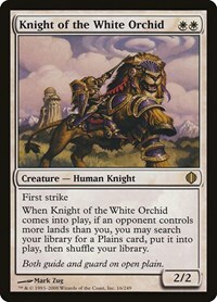 When Knight of the White Orchid comes into play, if an opponent controls more lands than you, you may search your library for a Plains card, put it into play, then shuffle your library.