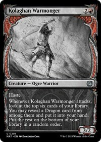 Whenever Kolaghan Warmonger attacks, look at the top six cards of your library. You may reveal a Dragon card from among them and put it into your hand. Put the rest on the bottom of your library in a random order.