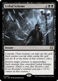 Destroy target creature or planeswalker. Each creature that convoked Lethal Scheme connives. (Draw a card, then discard a card. If you discarded a nonland card, put a +1/+1 counter on that creature.)