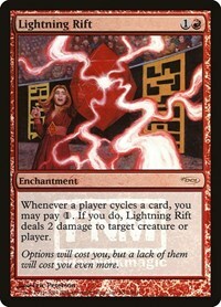 Whenever a player cycles a card, you may pay 1. If you do, Lightning Rift deals 2 damage to target creature or player.