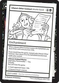 When Liliana's Other Contract enters the battlefield, you draw three cards and you lose 3 life. If you would lose the game, instead exile Liliana's Other Contract, then return to the battlefield transformed under your control.