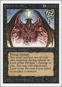 Flying, trampleYou must sacrifice one of your own creatures during upkeep or Lord of the Pit does 7 damage to you. You may still attack with Lord of the Pit even if you failed to sacrifice a creature.