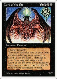 You must sacrifice one of your own creatures during your upkeep or Lord of the Pit does 7 damage to you. You may still attack with Lord of the Pit even if you failed to sacrifice a creature. Lord of the Pit may not be sacrificed to itself.