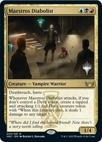 Whenever Maestros Diabolist attacks, if you don't control a Devil token, create a tapped and attacking 1/1 red Devil creature token with "When this creature dies, it deals 1 damage to any target.