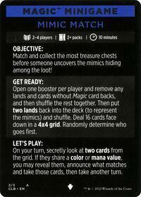 Open one booster per player and remove any lands and cards without Magic card backs, then shuffle the rest together. Then put two lands back into the deck (to represent the mimics) and shuffle. Deal 16 cards face down in a 4x4 grid. Randomly determine who goes first.