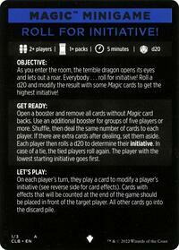Open a booster and remove all cards without Magic card backs. Use an additional booster for groups of five players or more. Shuffle, then deal the same number of cards to each player. If there are extra cards after dealing, set them aside. Each player then rolls a d20 to determine their initiative. In case of a tie, the tied players roll again. The player with the lowest starting initiative goes first.