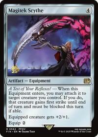 A Test of Your Reflexes! — When this Equipment enters, you may attach it to target creature you control. If you do, that creature gains first strike until end of turn and must be blocked this turn if able.