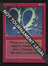 Whenever any land is tapped, Manabarbs does 1 damage to the land’s controller.